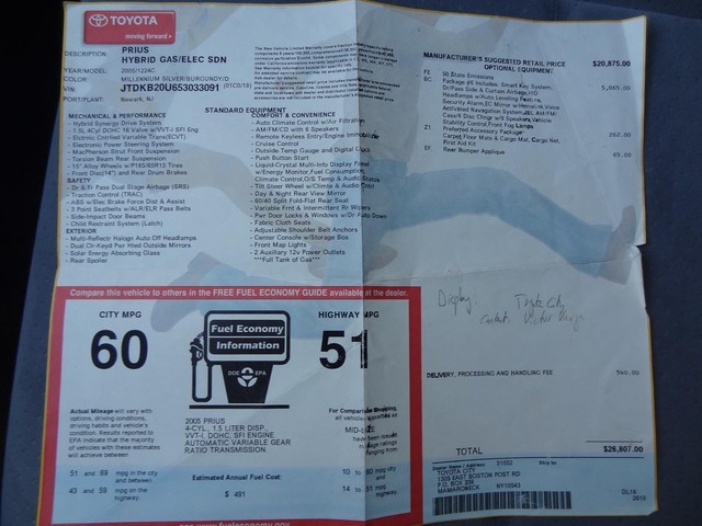 Print this listing NO RESERVE NAVIGATION XENON LIGHTS JBL-SOUND BLUETOOTH PUSH-BUTTON STARTBest Car DealsFeel free to contact us with all your questions!Philadelphia, PA 19116Call Us Today(267) 702-5788Ask ForBryanAsk Us A Question Vehicle DetailsYear: 2005Make: ToyotaModel: PriusVIN: JTDKB20U653033091Mileage: 153798Transmission: AutomaticEngine: 4 Cylinder, 1.5 LExterior Color: SilverInterior Color: GrayTitle: Clear Description1.5L HYBRID ENGINE!55MPG AVERAGE!2ND-OWNER! BRAND NEW TIRES! CLEAN! RUNS DRIVES GREAT! PACKAGE 5! LOADED!NAVIGATION! XENON LIGHTS! JBL-SOUND SYSTEM! BLUETOOTH! PUSH-BUTTON START! SMART KEY! KEYLESS ENTRY! CRUISE CONTROL! HOME LINKS! CASSETTE PLAYER! CD-PLAYER! POWER WINDOWS/MIRRORS/LOCKS! 4-WHEEL ABS! TRACTION CONTROL! VEHICLE STABILITY CONTROL! FOG LAMPS! REAR WINDOW WIPER! AND MUCH MUCH MORE!This is a great previously owned vehicle.The engine on this vehicle is running properly.The mileage represented on this vehicle is accurate.This vehicle has a smooth shifting transmission.All power equipment is functioning properly.Overall, this vehicle's exterior is clean.The interior is clean and in good condition.Please make sure you have read and understood our description along with our terms and conditions before placing your bid.If you have any questions about this or any of our other auctions please feel free to contact us via e-mail or you can call us at(267) 702-5788.If you are thinking of purchasing this vehicle, no need to wait until the end of the auction.Most of the auctions could be ended earlier with a reasonable offer. So do not wait till last minute.Just call (267) 702-5788 TO MAKE A DEAL!Thank you for your interest and we look forward to hearing from you. Features & Options 60/40 Split-Fold Rear Seat AM/FM Stereo Adjustable Steering Wheel Air Bag Air conditioning Alloy Wheels Anti-Skid Control Anti-lock brakes Automatic Transmission CD player Cassette player Center Arm Rest Climate Control Cloth Upholstery Cruise control Cup Holders Digital Clock Digital Instruments Driver airbag Floor Mats Fog Lamps Front Bucket Seats Front-Wheel Drive HomeLink Interior Hood Release Interval Wipers Keyless Entry Map Light Navigational System Panic Button Passenger airbag Power Mirrors Power Steering Power locks Power windows Premium Sound System Rear Defroster Rear Spoiler Rear Window Wiper Rear seat fold-down armrest Security System Steering Wheel Controls Third Brake Light Tilt Steering Column Traction Control Trip Odometer Vanity Mirror(s) Xenon Lights Additional PhotosRear passenger\'s side door Warranty Information This vehicle is being sold as is, where is with no warranty, expressed written or implied. The seller shall not be responsible for the correct description, authenticity, genuineness, or defects herein, and makes no warranty in connection therewith. No allowance or set aside will be made on account of any incorrectness, imperfection, defect or damage. Any descriptions or representations are for identification purposes only and are not to be construed as a warranty of any type. It is the responsibility of the buyer to have thoroughly inspected the vehicle, and to have satisfied himself or herself as to the condition and value and to bid based upon that judgement solely. The seller shall and will make every reasonable effort to disclose any known defects associated with this vehicle at the buyer's request prior to the close of sale. Seller assumes no responsibility for any repairs regardless of any oral statements about the vehicle. We've taken the responsibility to provide you with all information we have available regarding this vehicle. However, not all information regarding this vehicle has been obtained and therefore it is advisable to have and independent mechanic review this vehicle and obtain a vehicle history from CarFax. This vehicle is sold "as is" and "where is" without any express or implied warranties, INCLUDING BUT NOT LIMITED TO THE IMPLIED WARRANTIES OF MERCHANTABILITY, FITNESS FOR A PARTICULAR PURPOSE OR NON-INFRINGEMENT. IN NO EVENT SHALL WE BE LIABLE FOR ANY SPECIAL, INDIRECT, PUNITIVE OR CONSEQUENTIAL DAMAGES RESULTING FROM ANY USE OR PERFORMANCE OF OR CONTENT ERRORS OR OMMISIONS OF INFORMATION. The purchaser will bear entire expense of repairing or correcting any defects that may presently exist or that may occur in the vehicle. We neither assume nor authorize any other person to assume for it any liability in connection with the sale of this vehicle. Terms & Conditions SHIPPING IS SOLELY BUYER'S RESPONSIBILITY, BUT WE CAN HELP YOU TO MAKE ARRANGEMENTS. PLEASE EMAIL US YOUR ZIP-CODE TO GET SHIPPING QUOTES. All vehicles are sold AS-IS WHERE-IS with NO WARRANTY written nor implied. It is solely buyer's responsibility to satisfy himself as to the condition of the vehicle PRIOR to bidding. You are more than welcome to inspect a vehicle in person or if you are unable to do so, you can arrange a third party inspection by using eBay service or any other certified mechanics at your choice. No inspection will be made after you won the auction.All test-drives and inspections are welcome!Please call us to arrange a test-drive or inspection BEFORE the auction ends. ALL SALES ARE FINAL and the winner of the auction is required by eBay to pay in full by placing his bid. We require payment within 3 business days and vehicle to be picked up in timely manner. Buyer is required to contact us within first 24 hours and leave us his name and contact phone number.ATTENTION BIDDERS! If you're planning on bidding on multiple items at one time you MUST get pre-approved! Send us your FULL NAME and CONTACT NUMBER or call us. Otherwise, your bids will be cancelled and you'll be blocked from bidding on our items. NO EXCEPTIONS!All the non-pay bidders will be reported to eBay and unpaid item record posted. We have to follow eBay policies and do what we're required to do. So PLEASE make sure you have read and understood our terms and conditions BEFORE you place your b