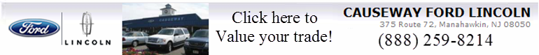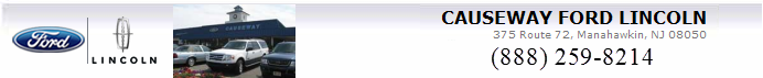The Causeway Family of Dealers is a family owned and operated establishment founded in January of 1969. We have a customer service approach to selling the most popular vehicles. We have seven different brands: Ford, Lincoln, Mercury, Honda, and Nissan. We also have some of the best used cars around. Now, what makes us different than the others? We give Free oil changes for Life, we offer Free loaner cars to service and body shop customers, and much much more. Our Ford store won the “Presidents Award” 18 Years in a row. We are located 9 miles from Long Beach Island, NJ. Just get off exit 63 on the Garden State Parkway and head east (you can't miss us). You can reach us by phone: 1-888-259-8214).